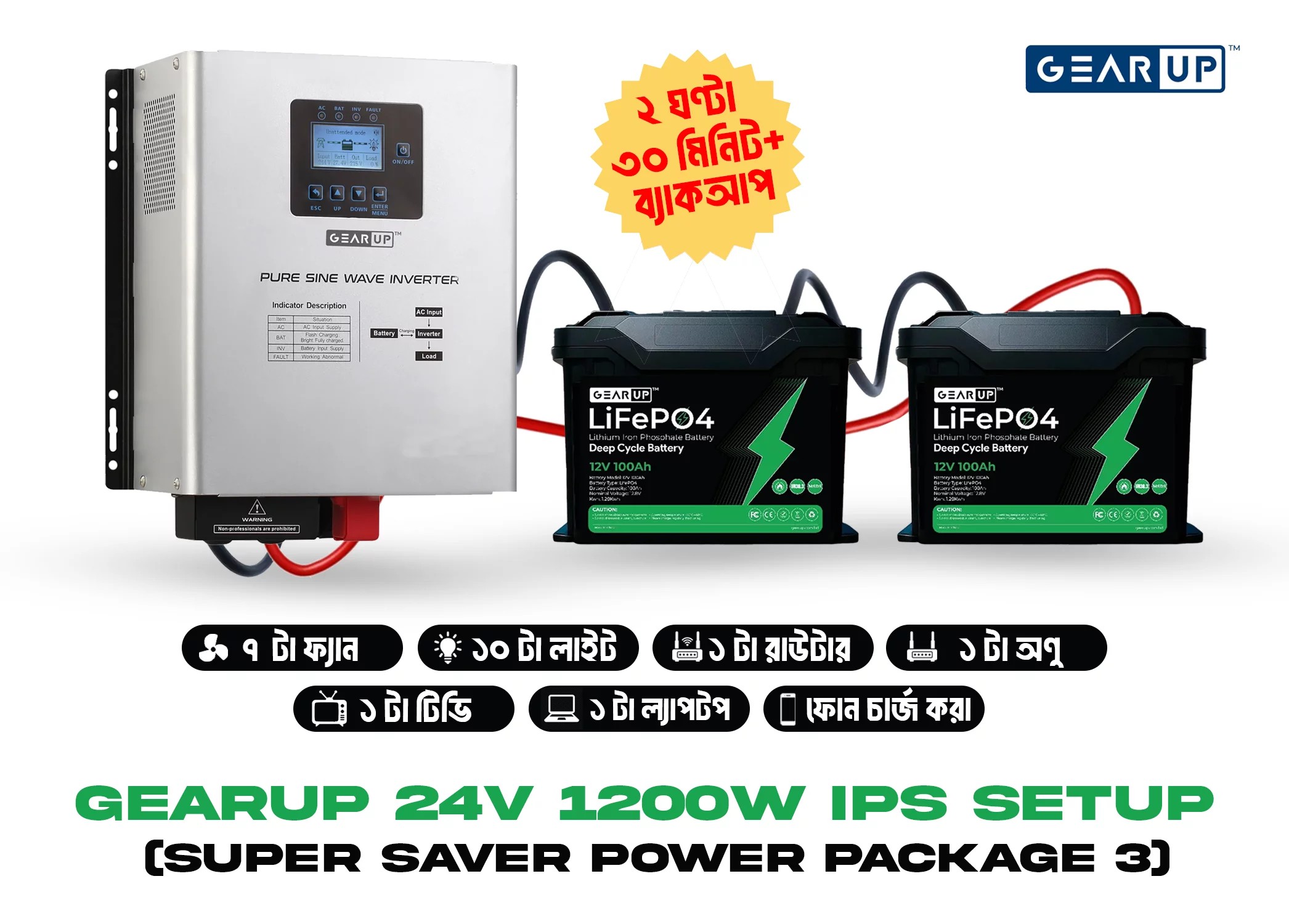 GearUP IPS setup (Super Saver home Package 3): GearUP 1200W, 24V, Pure Sine Wave Inverter (Without Solar) + 2pcs GearUP 12V 100Ah LifePO4 Lithium Battery with Smart BMS & Bluetooth